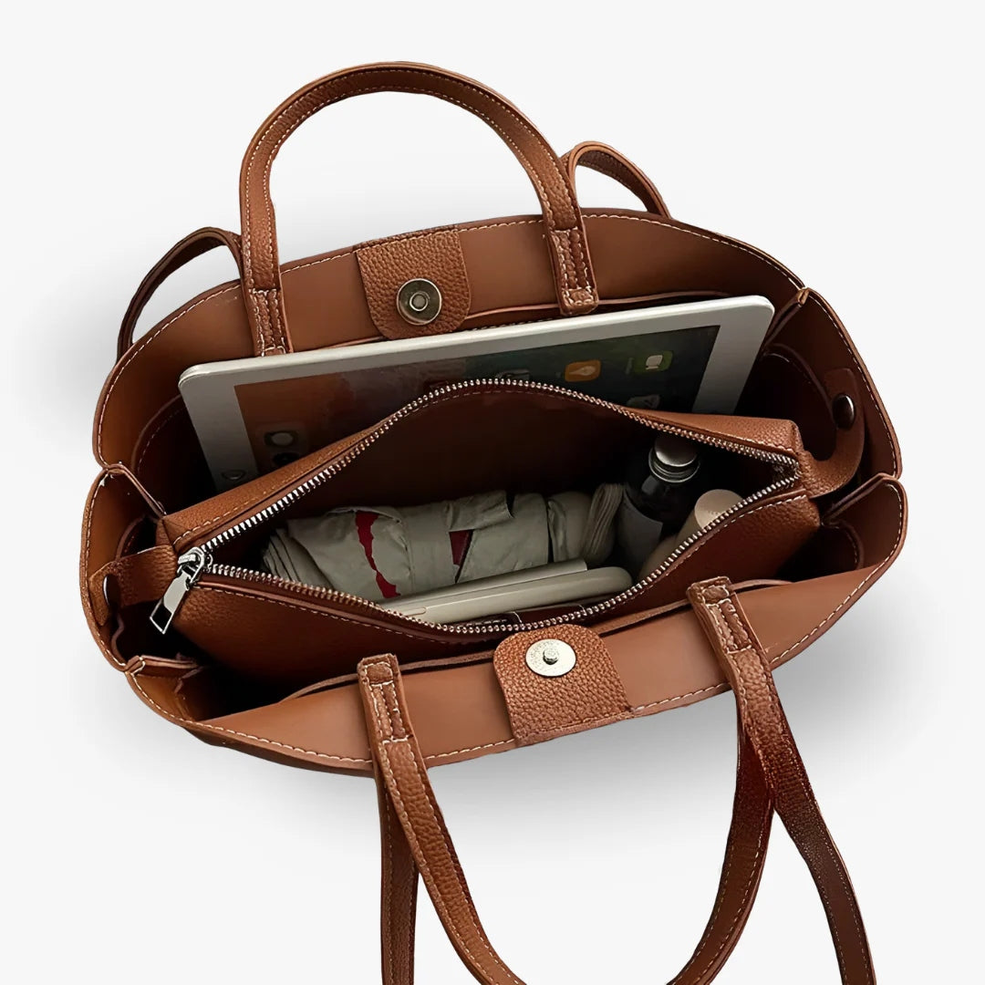 حقيبة إيما الخاصة بنا مصنوعة من جلد نباتي عالي الجودة، تجمع بين الأسلوب الكاجوال والمتانة. مصممة لتكون واسعة بما يكفي، تستوعب بسهولة أساسياتك: الكمبيوتر المحمول، مستحضرات التجميل والإكسسوارات اليومية.